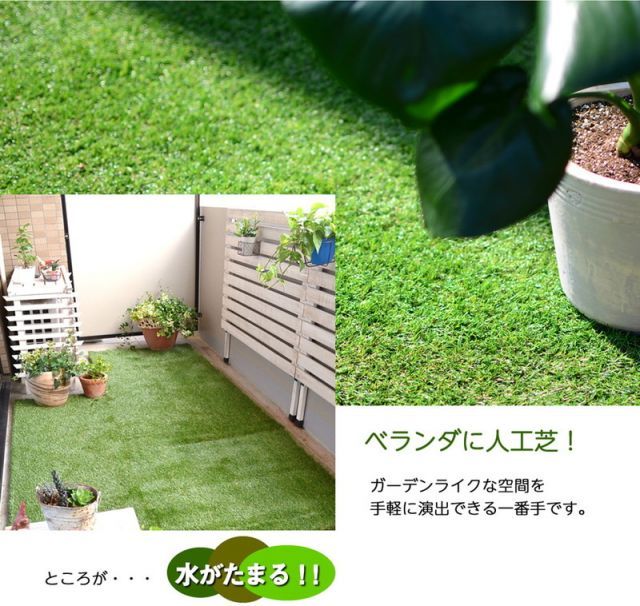 リアルな見た目の人工芝ロールと、ベランダやバルコニー等のコンクリート床に設置することで水はけ効率が良くなる床マットをセットにしました。