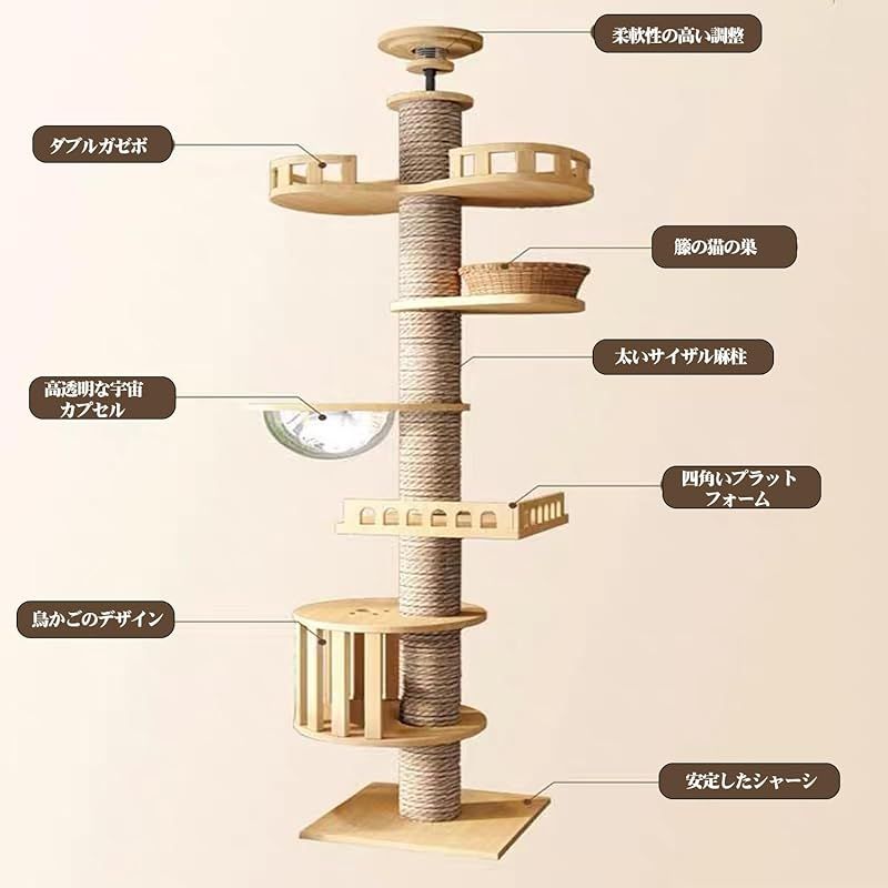 【?品?格】本体高さ240~250cm, 265-275cm調節可能、台座・幅40×奥行40×厚さ2.4cm、柱・径11cm、棚板・幅40×奥行35×厚さ1.3cm、猫のケージ・幅40×奥行40×厚さ1.3cm,宇宙船・幅29×奥行29×深さ15cm,重量(約):10kg