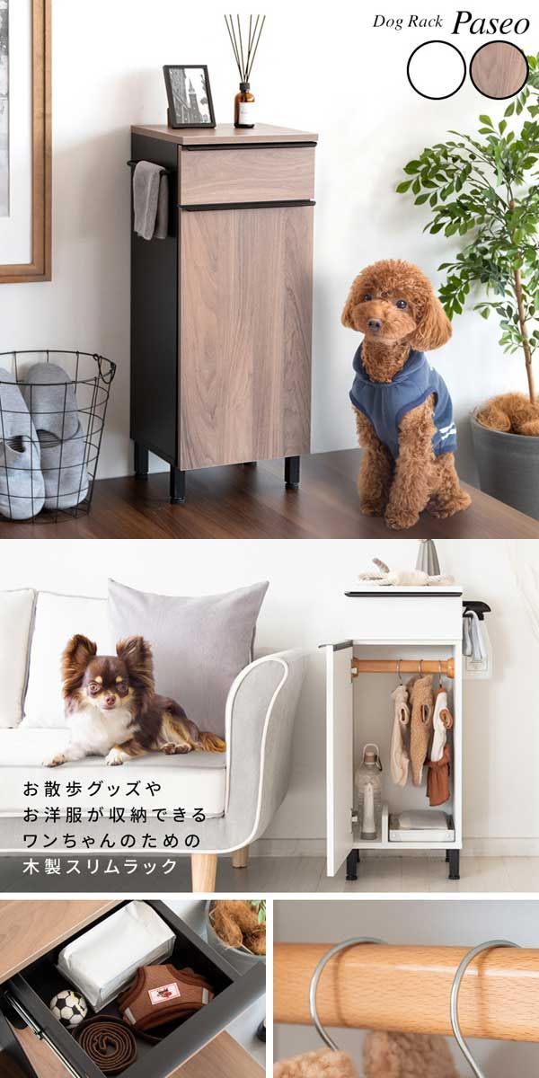 お洋服やハーネスなど、ワンちゃんのお散歩グッズをまとめて収納できるスリムラック『Paseo(パセオ)』。