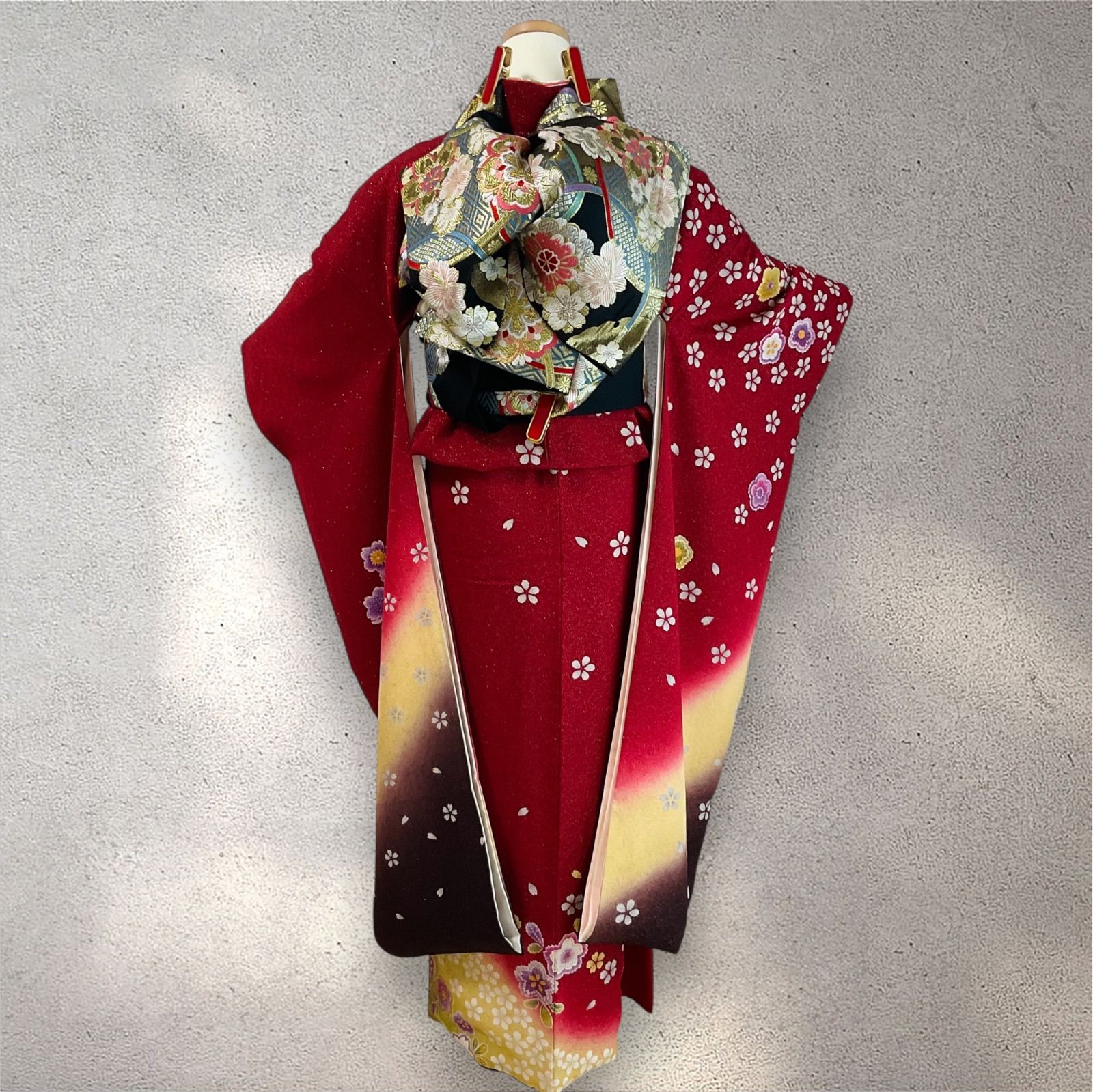振袖 振袖フルセット 赤系 濃い赤 金通し 桜 花びら 正絹