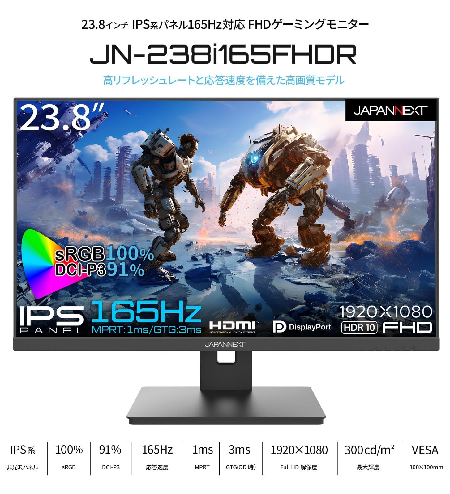 在庫 視野角178° HDMI DisplayPort VESA対応 ブルーライトカット ディスプレイ JN-238 i 165 FHDR パネル IPS 1920 x 1080解像度 フルHD 1 ms Hz ゲーミングモニター 23.8インチ J