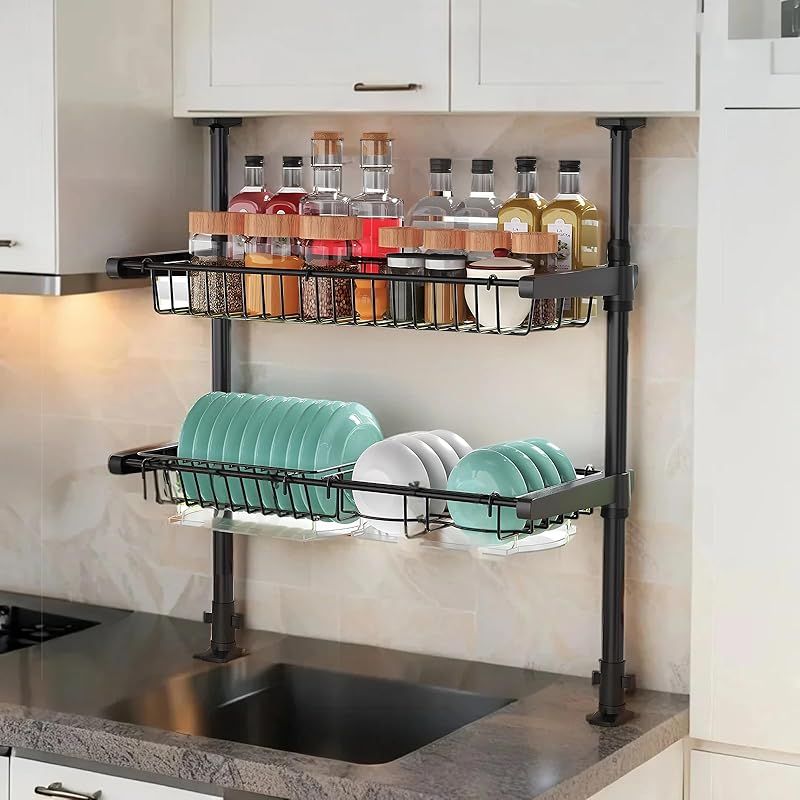 水切りラック 突っ張り バスケット式 高さ68 110 cm調節 耐荷重20 kg 大容量 シンク上 おしゃれ 3段 キッチンラック 水切りかご バスケット 炭素鋼製 格納式シンク排水ラックポットラック ABS素材 省スペース 組み立て簡単 穴開 1