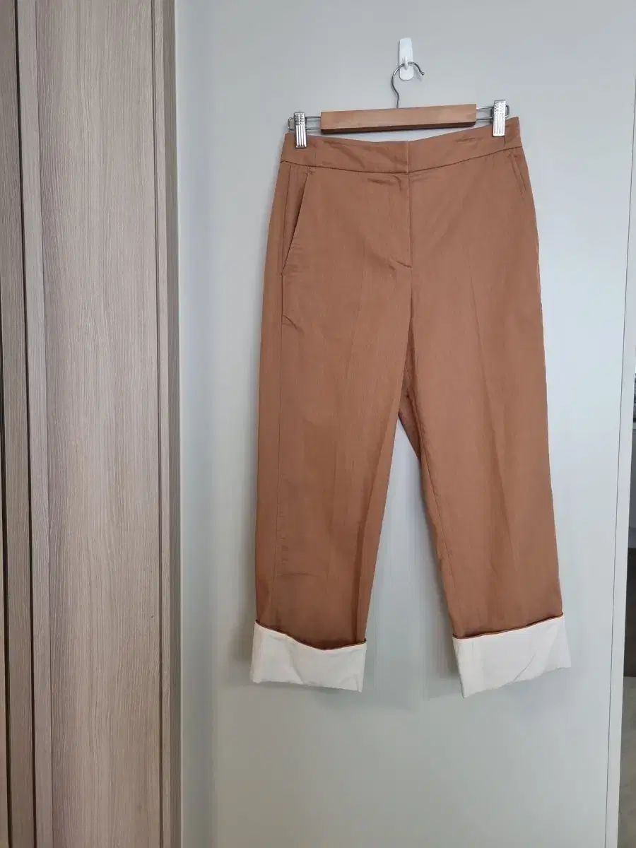 SJSJのロールアップコットンパンツです。ライトブラウンの色はロールアップデザインが特徴です。カジュアルながらも洗練された雰囲気を演出できます。