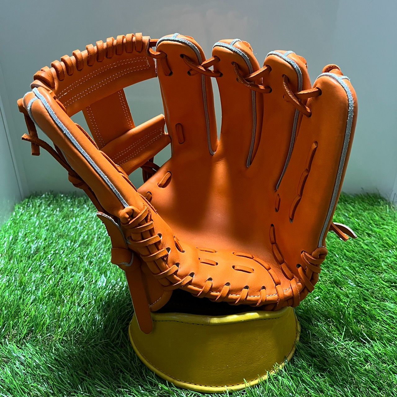 型付け時のシミが取れないことと、全体的に色が抜けたような気がしたのでアウトレットにまわしました。このオレンジは染色が良くなかった為、採用しませんでした。写真ではわかりにくいですが、捕球面にシミがありますのでご了承ください。