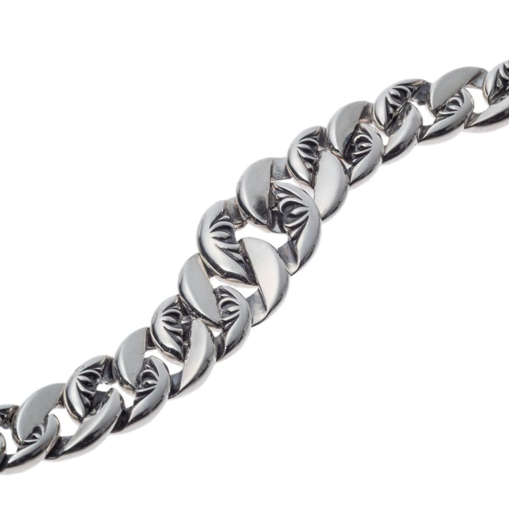 手首に宿る、彫刻の気配。SV925の喜平をベースに、コマごとに唐草を刻み込んだチェーンは、根元から先端へとわずかにサイズを太くしていき、流れるような陰影を描きます。脱着はナスカン式。留め具にはローズを立体彫刻で配し、機能と美を一体化。鏡面と燻しのコントラストが銀の艶をいっそう深く際立たせ、装いに確かな存在感を与えます。角の面取りや裏面の磨きまで丁寧に仕上げ、長時間の着用も快適。程よいボリュームと心地よい重量感が、動くたびに光を拾い、品格ある輝きを放ちます。最終ポリッシュまで、ブランドの基準を満たす品質で、提携アトリエが精巧に形にしています。Tシャツからジャケットまで自在に馴染み、単体でも重ねても手元の主役に。裏面にはブランドロゴと〈925〉の品質刻印。日常をさりげなく格上げする、アートピースのようなブレスレットです。