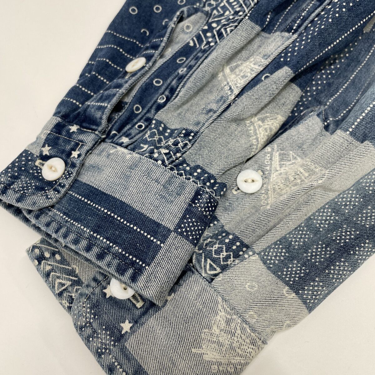 RRL ダブルアールエル インディゴ×ブルー バンドカラー プリント パッチワーク シャツ M