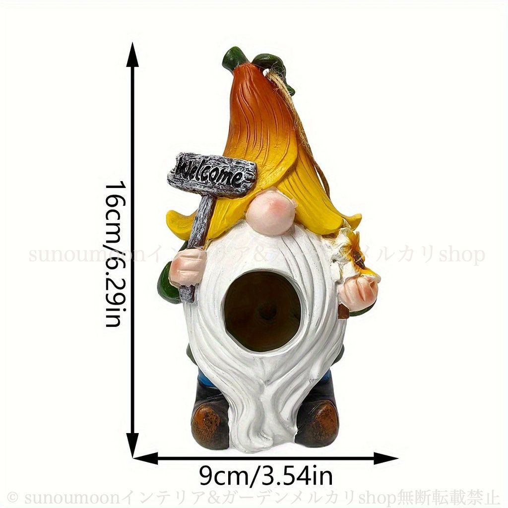 本製品は耐候性のある素材で作られており、屋外での使用にも適しています。庭や小道に飾られることで、自然の中に温かみや趣を加え、豊かなみどりが広がるスペースに華やかさを添えます。ノームがまるで妖精のようにそっと見守っているかのようなデザインは、庭の中で特別な存在感を放つでしょう。