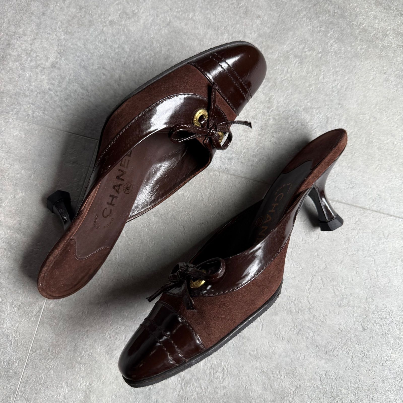 CHANEL シャネル リボンパンプス ミュール ココマーク レザー スエード ブラウン ゴールド金具 36 1 2 23.5 cm