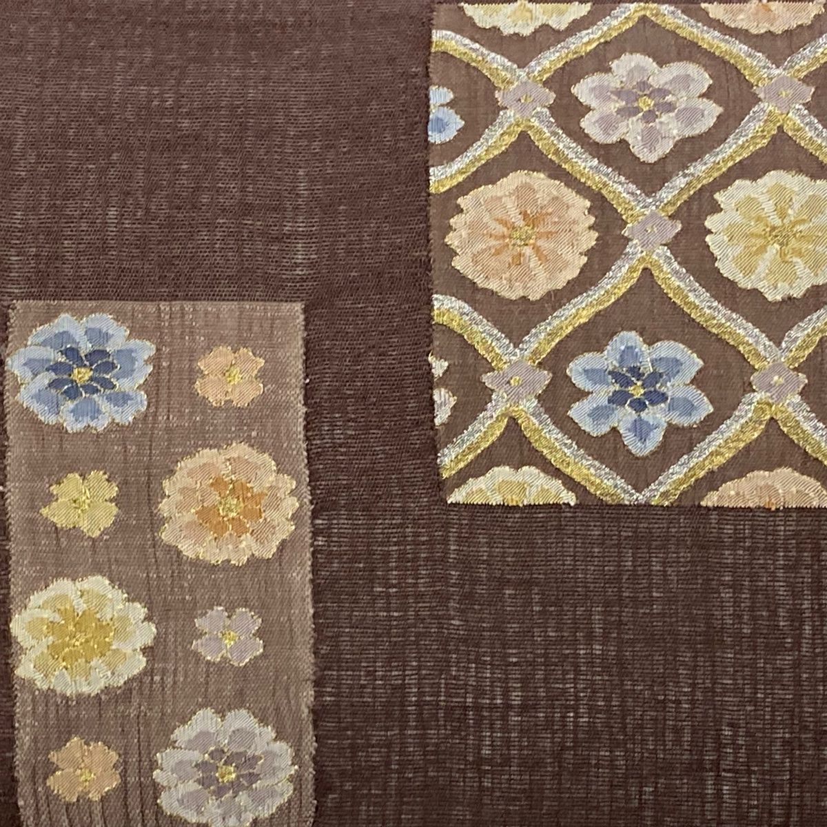 名古屋帯 夏帯 花柄 斜め格子 金銀糸 焦茶色 正絹