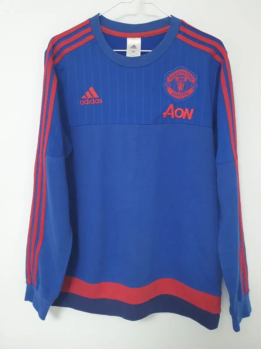 これは正規品 adidas (アディダス) マンチェスターユナイテッド15/16シーズントレーニングトップです。マンチェスター・ユナイテッドのエンブレム、adidas (アディダス) ロゴ、AONのスポンサーマークがあしらわれた長袖トレーナー。赤と青がはっきりとデザインされています。ロゴの底の70%がコットン製なので、暖かく過ごせます。