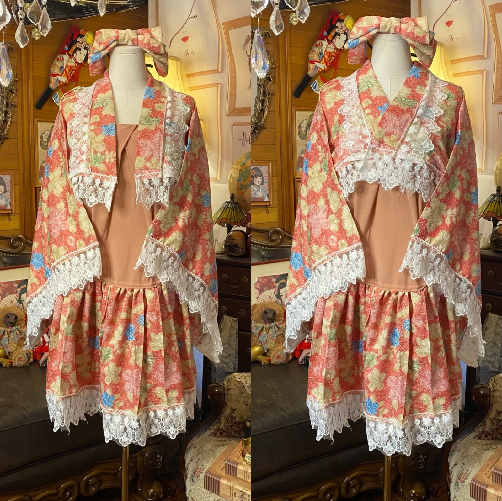 コーラルピンク地に生成り・水色・淡イエローの菊がふわりと咲くヴィンテージ羽織生地を主役に、白のケミカルレースをとろりと添えた甘美なドッキングセット。短丈ボレロはたっぷり袖と衿のレースが顔まわりを華やかに見せ、前を重ねて“着物風”にも、さらりと羽織って“ボレロ風”にも楽しめる2WAY。ワンピースは肌なじみの良いペールピンクのキャミトップに、同柄生地のギャザーフリルスカートをドッキング。やさしいコーラル×白レースに水色の差し色が映える、レトロガーリーな一点物。お茶会やお出かけ、記念日の装いにもぴったりです。