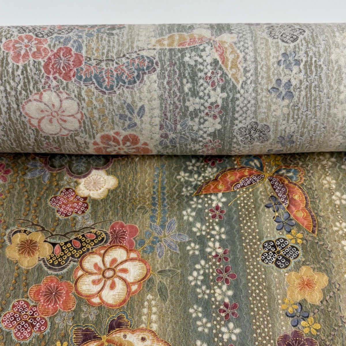 反物 秀品 小紋 蝶 松梅 金彩 灰緑 正絹