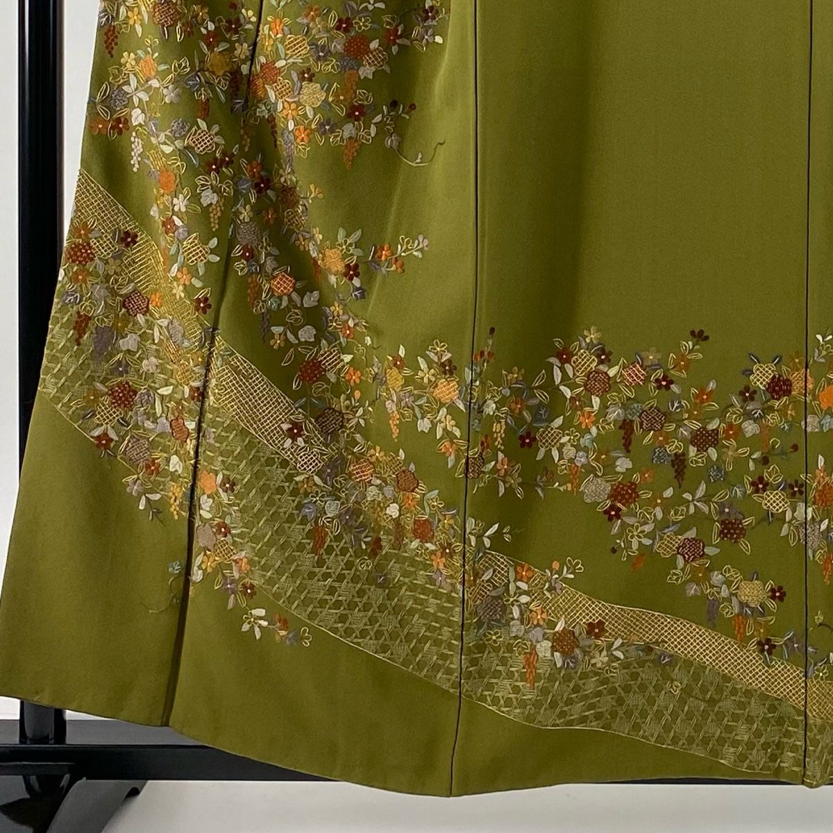 訪問着 身丈158 cm 裄丈66 M 袷 草花 籠目 刺繍 金糸 茶緑色 正絹