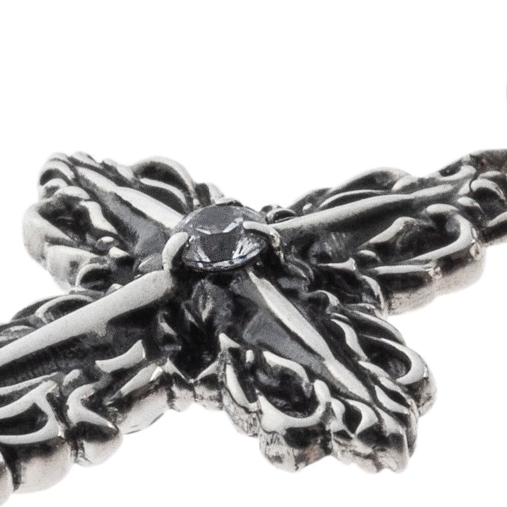 幾重にも重なる唐草と十字架で、クロスを象ったアートなピアス。細かく繊細に彫り込んだデザインで、丁寧に造られた精巧な作り。程よいサイズで着け心地も良好。裏にはブランドと925の品質刻印。センターの石はCZクリアー。※1個単位(片耳分)での販売となります。