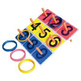 ●内容/ボード1個、リング(赤・青・黄各3本)●サイズ/ボード:30×30cm●材質/ボード:木、ポール:ABS、輪:TPR、数字板:EVA