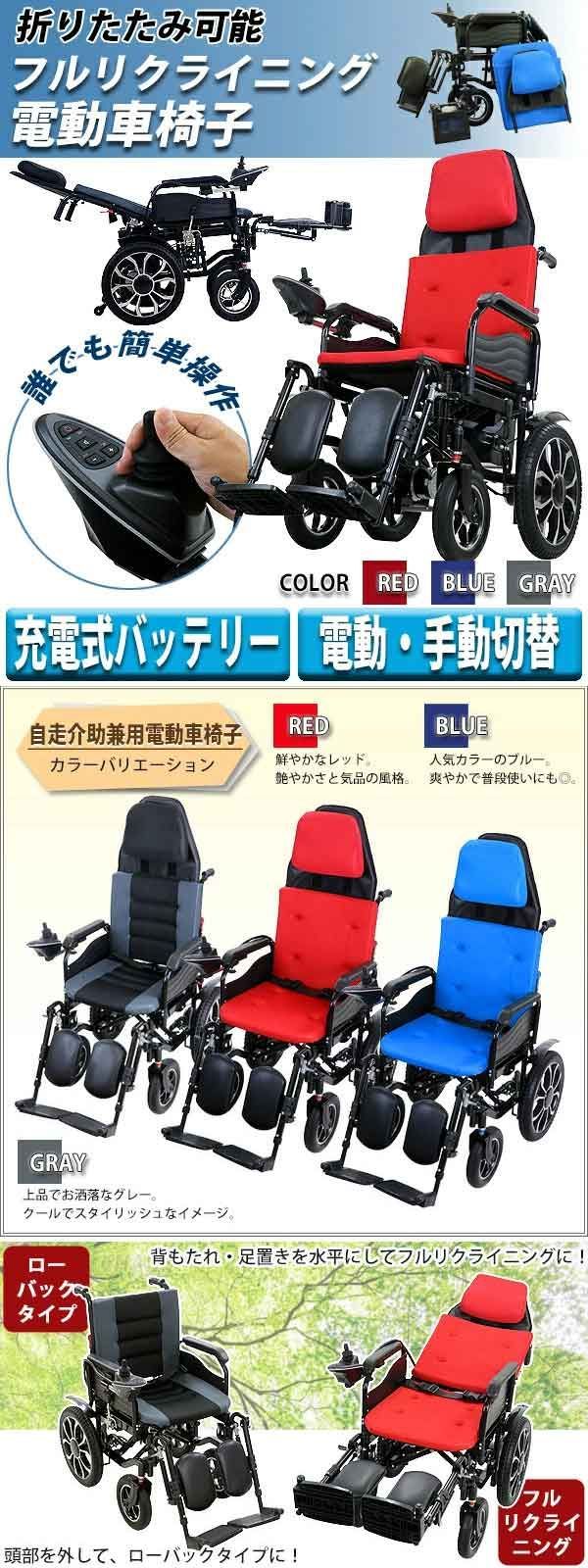 フルリクライニング電動車椅子 PSE適合 折りたたみ ノーパンクタイヤ 自走介助兼用 リクライニング電動車椅子 電動 手動 充電 電動ユニット 電動アシスト 電動カート 折り畳み 車椅子 車イス 車いす 介護 福祉 ewheelchaire 05 a レッド