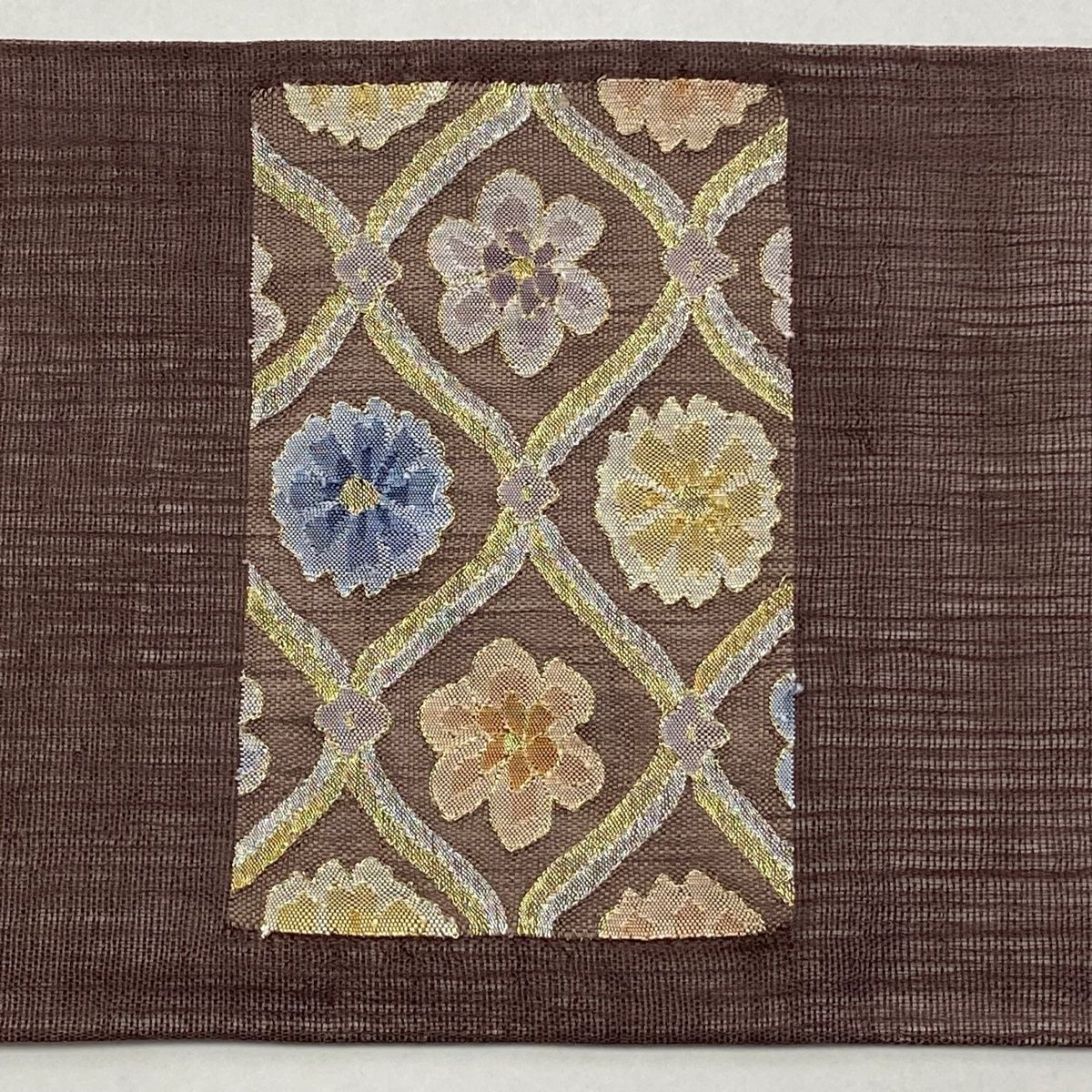 名古屋帯 夏帯 花柄 斜め格子 金銀糸 焦茶色 正絹