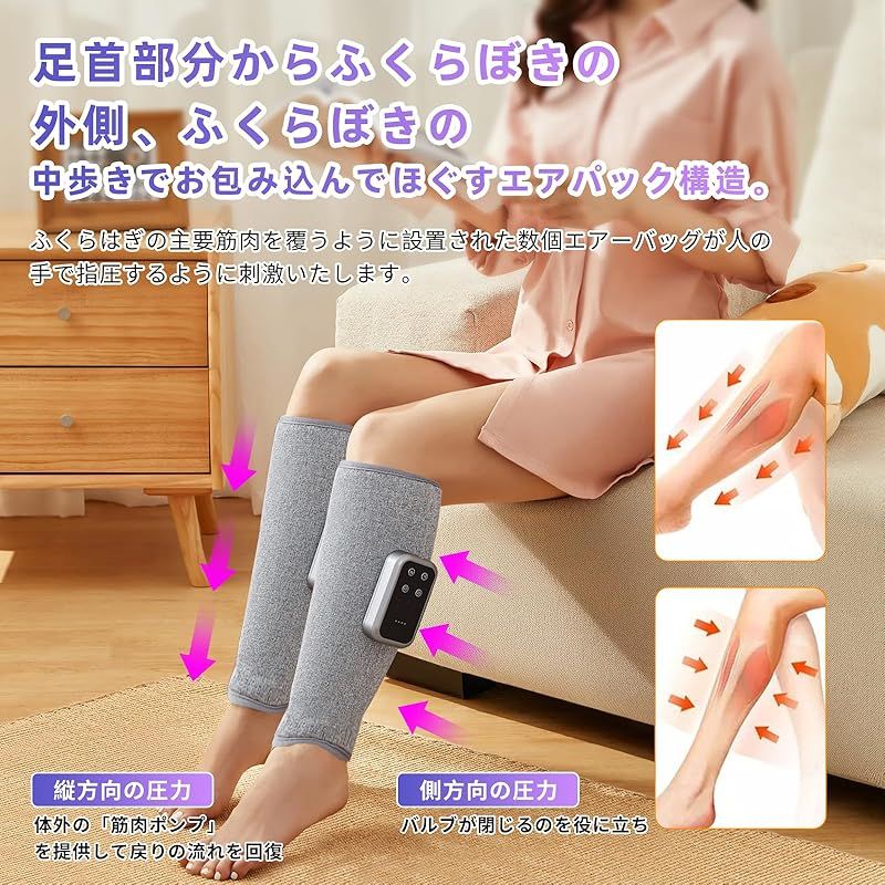 商品名:【2025新登場・空気圧・温熱】ふくらはぎリラックス エアーレッグリラックス 空気圧 温熱 太もも 足ケア Tpye-C充電式 コードレス 3つ空気圧モード 3段階強度 3段階温度 20分自動オフタイマー サイズ幅調節可 操作簡単 運動後/座り仕事/立ち仕事/